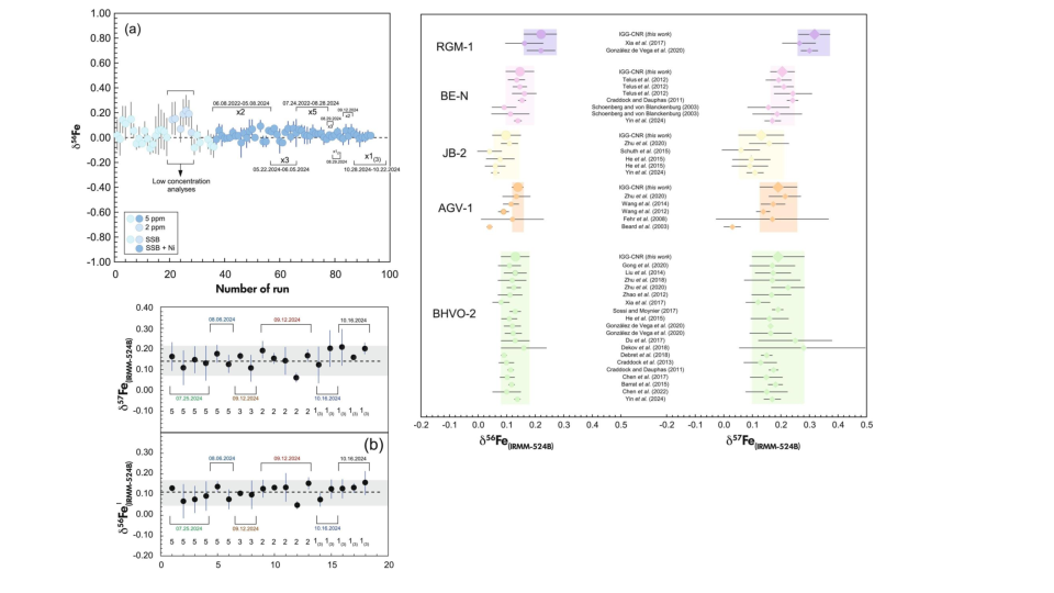 As part of the TEOREM (PRIN-MUR 2017AK8C32) and ITINERIS (IR0000032; PNRR; Next Generation EU) projects, a methodology was developed for determining Fe isotope ratios with high precision using the MC-ICP-MS Neptune Plus mass spectrometer (Thermo Scientific). Specifically, widely used geological reference materials (JB-2, BHVO-2, BE-N, AGV-1 and RGM-1) were analysed, obtaining results consistent with data already published by various laboratories around the world.