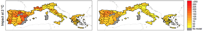 Simulazione, con un modello data-based guidato dalle proiezioni climatiche, del potenziale aumento (in percentuale) dell’area bruciata dagli incendi boschivi, per un aumento di temperatura globale di 2 °C rispetto ai valori pre-industriali