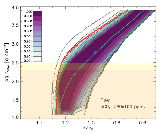 Simulazione numerica dell’indice di abitabilità (0; inabitabile; 1: acqua liquida su tutto il pianeta) in funzione della radiazione stellare incidente (normalizzata a quella della Terra) e della massa colonnare dell’atmosfera.