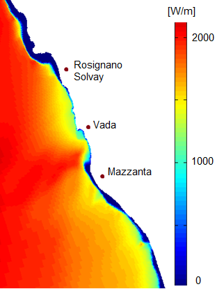 Simulazione numerica ad alta risoluzione (con il modello Delft3D) dell’intensità del trasporto di energia verso costa in inverno